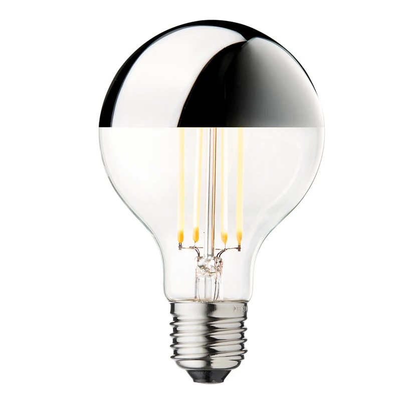 Ampoule à tête miroir LED Globe 80 Crown E27, argent, 3,5 W, 2.700 K, intensité variable L'ampoule à LED Globe 80 Crown avec culot E27 séduit par sa taille globe très appréciée, par sa couleur de lumière chaude et par sa tête miroir argentée. Elle est par exemple parfaitement adaptée aux luminaires DESIGN BY US Wanted et New Wave Optic XL, mais fait naturellement bonne figure dans tout luminaire de conception ouverte avec douille E27. Globe 80 Crown est en outre à intensité variable.