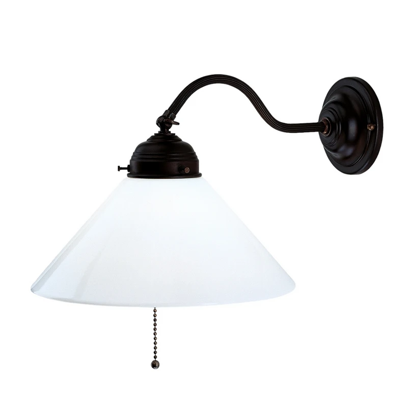 Applique murale Alfred en laiton facile à entretenir Le modèle ALFRED est une applique murale en laiton qui se commande à l'aide d'un interrupteur à tirette. Cette lampe a été conçue à partir d'anciens modèles datant de 1900 et est fabriquée à la main. Presque exclusivement des pièces en laiton pur sont associées à l'abat-jour en verre soufflé à la bouche. Pour obtenir l'aspect antique du support, le laiton est teinté d'une patine qui n'est pas vernie. Il en résulte une surface qui ne doit être essuyée qu'avec un chiffon sec - seul un peu d'huile d'olive est recommandé pour l'entretien.