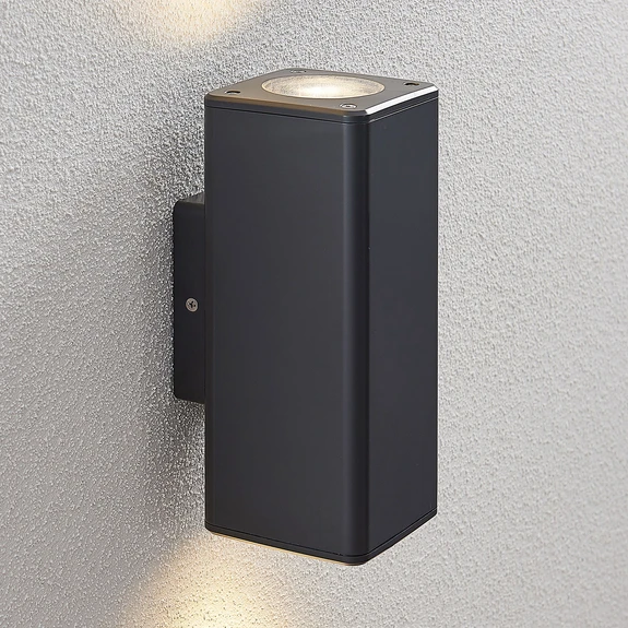 Nati est une source lumineuse en extérieur qui dispense sa lumière à la fois vers le haut et vers le bas, créant une lumière directe et indirecte. Le fonctionnement de la lampe nécessite deux ampoules LED GU10. Le corps de l’applique d'extérieur est en matériau synthétique et la finition gris foncé paraît agréablement intemporelle et sobre. De plus, le corps du matériau synthétique est résistant à l'eau de mer et se prête aussi à une utilisation près de la mer. La résistance élevée aux chocs IK06 promet également une installation durable en extérieur, parce que le luminaire est assez robuste pour y être utilisé.
