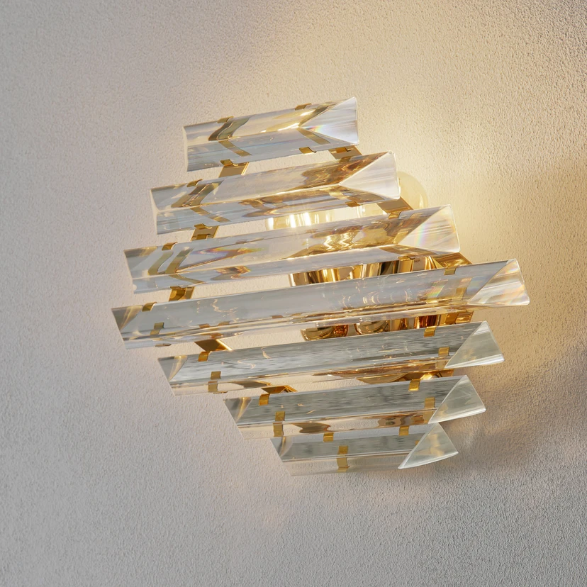 Applique murale en cristal Losanghe avec cadre métallique doré 24 caratsLosanghe est une applique murale en cristal à la note particulièrement classique. Le cadre métallique doré, que l'on peut voir à travers les tiges de cristal, en est la principale raison. Pour une lumière étincelante dans le couloir, le salon ou la chambre à coucher.