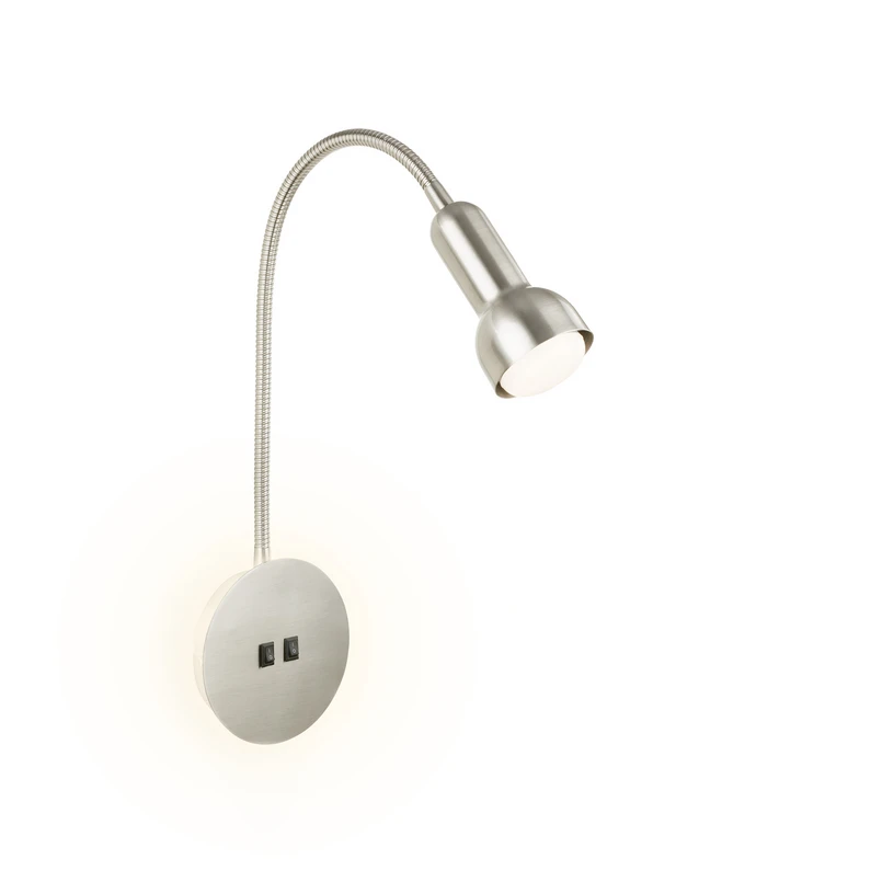 Applique murale LED 2178012/2178015Cette applique murale est particulière avec ses deux sorties de lumière. Le spot, monté sur un bras flexible et donc orientable selon les besoins, est équipé d'une douille E14 pour un réflecteur LED de 10 W maximum. Le spot garantit un éclairage parfait pour la lecture. La deuxième source de lumière est constituée par des LED blanc chaud placées autour du support mural rond, qui diffusent un bel effet de lumière sur le mur et servent d'éclairage d'appoint confortable. Les deux sources lumineuses peuvent être allumées séparément à l'aide des deux interrupteurs situés sur le support mural, de sorte que les deux sources lumineuses peuvent être allumées ensemble, mais aussi chacune séparément.