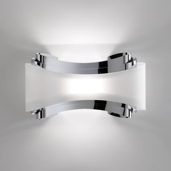 La lampe murale Ionica a une forme incurvée inhabituelle, créée par trois couches de largeurs différentes disposées l'une derrière l'autre. Les deux couches arrière sont en acier chromé. Celle-ci est découpée au laser puis façonnée à la main. Le luminaire est complété par la couche frontale de verre satiné qui entoure les feuilles d'acier.