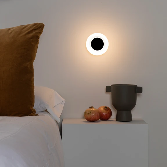 Le concept de l'applique LED Moy rappelle un haut-parleur rond. Son abat-jour en verre, en forme de boule aplatie sur deux côtés, est blanc avec une application noire sur la face avant. Il diffuse une lumière blanche et chaude sans éblouir.
