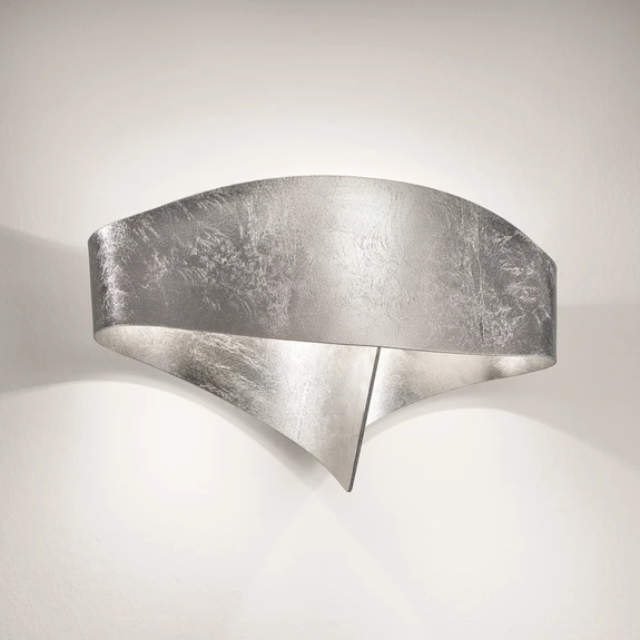 Le processus de fabrication élaboré de ce luminaire représente à lui seul une particularité. L'acier est d'abord découpé au laser en une bande appropriée. Celui-ci est ensuite plié à la main pour créer une forme inhabituelle, artistiquement incurvée. Cette forme distingue clairement ce produit de luminaire des autres. La bande était recouverte d'une précieuse feuille d'argent, ce qui donne à cette lampe un aspect incroyablement élégant.