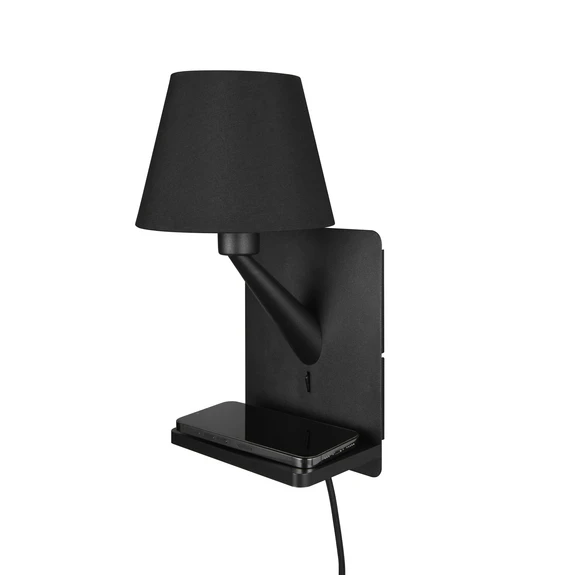 Applique murale Comfort avec abat-jour et nombreuses fonctions L'applique murale Comfort monochrome en métal avec abat-jour textile prouve son nom par ses nombreuses fonctions. Elle est équipée d'un interrupteur pour une commande directe, se branche aussi bien sur une prise de courant que directement sur un raccordement mural, offre une station de recharge inductive sur le plateau pratique pour le téléphone portable et est équipée d'un port USB et d'un port USB-C. Ces caractéristiques en font la source de lumière idéale au lit.