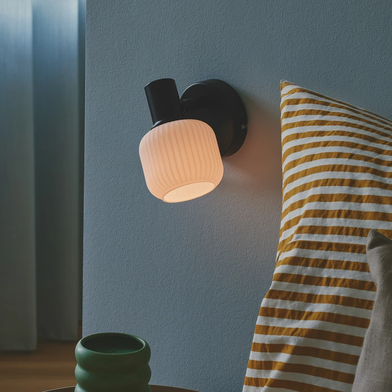 Applique murale Milford Mini avec abat-jour en verre soufflé Milford Mini est une série de luminaires décoratifs pour les pièces les plus diverses, travaillée dans le style Japandi dans un mélange de verre opale soufflé à la bouche avec une belle surface striée et de métal noir. L'applique murale de la série est équipée d'un câble avec fiche, ce qui permet de la brancher facilement sur une prise de courant, mais elle peut aussi être raccordée directement au mur avec le câble retiré. L'abat-jour peut être orienté et tourné selon les besoins.