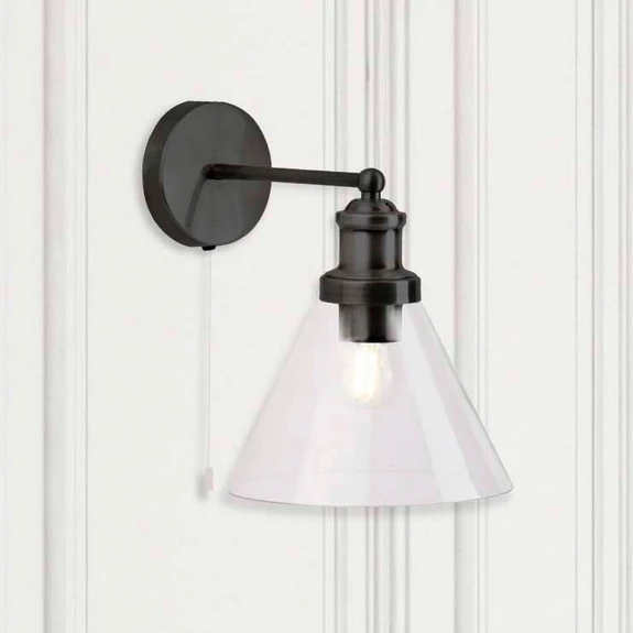 Applique murale Pyramid en noir avec verre transparent L'applique murale Pyramid est composée d'un support mural rond, d'un bras qui s'étend dans la pièce et d'une douille d'ampoule en acier de construction peint en noir. La lampe est complétée par un verre clair en forme de pyramide qui laisse entrevoir l'ampoule utilisée, c'est pourquoi il est recommandé d'utiliser une ampoule décorative à filament ou une ampoule rustique pour augmenter encore l'esthétique de cette belle source de lumière supplémentaire. - utilisation facile grâce à un interrupteur à tirette intégré
