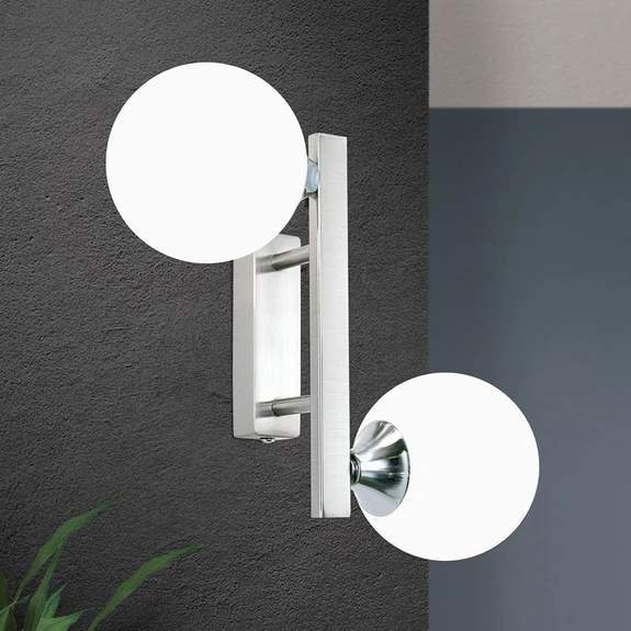 Applique murale Snowwhite avec deux boules en verre blanc opalin sur une structure métallique Une structure en métal et deux boules en verre blanc opalin en guise d'abat-jour - voici l'applique murale Snowwhite à 2 lampes. De chaque côté de la structure se trouve une boule de verre dans laquelle est logée une douille G9. L'applique murale peut être fixée au mur aussi bien verticalement qu'horizontalement et peut être équipée d'ampoules halogènes jusqu'à 20 W ou d'ampoules LED efficaces en énergie avec culot G9. Homogène et sans effet d'éblouissement, la lumière rayonne très agréablement à travers les sphères blanc opale.