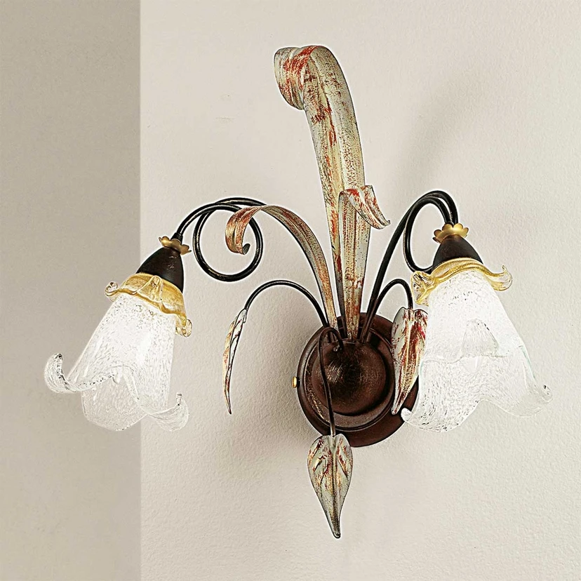 Applique ludique Giuseppe de style florentin L'applique Giuseppe séduit par ses nombreux détails issus du monde des fleurs. Le support est orné de différentes feuilles dorées, les bras de l'applique sont enroulés comme les branches délicates d'un jeune arbre et l'abat-jour en verre ressemble à des fleurs. Fabriqué en Italie.