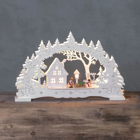 L'arc lumineux LED Village est idéal pour décorer les étagères, les commodes, les tables et tout particulièrement les rebords de fenêtres pendant la période de l'Avent et les fêtes de fin d'année. Il représente une charmante scène de village hivernale et plonge la pièce dans un éclat scintillant. Les LED à éclairage blanc chaud illuminent non seulement la forêt hivernale, mais aussi la maisonnette et la lanterne. Le transformateur est inclus dans la livraison. Fonctionne aussi avec des piles. Câble d'alimentation de 5 m doté d'une fiche inclus.