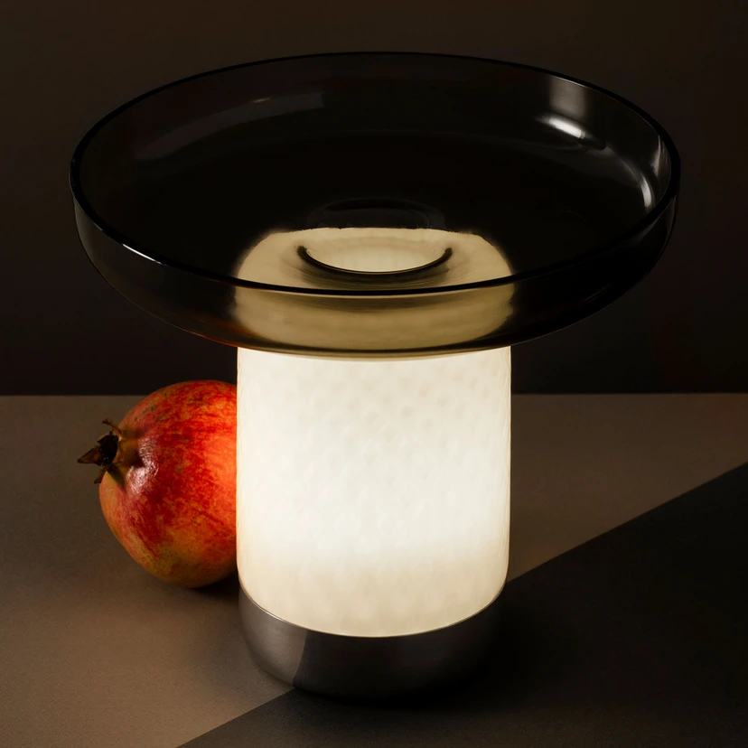 Lampe de table LED portable Bontà avec coque en verre et variateur d'intensité variable coulissant La lampe de table LED portable Bontà a été conçue par les designers Attila Veress et Davide Oldani en collaboration avec le fabricant de luminaires italien Artemide. Grâce à sa fonctionnalité, elle se prête surtout à une utilisation dans les restaurants, les hôtels ou les bars. Mais la lampe est également un véritable talent polyvalent dans le domaine privé et convient par exemple particulièrement bien pour servir des snacks. La lampe à poser est en verre dépoli structuré et plonge l'environnement dans une atmosphère détendue grâce à sa lumière chaude. Sur le dessus, un évidement permet d'insérer une coupe en verre. Des aliments tels que des friandises, du pain ou des fruits peuvent y être présentés aux invités et proposés à la consommation. Comme le bol en verre, tout comme la lampe, est en verre fait à la main, chaque élément de la lampe à poser est unique. Grâce à son fonctionnement sur batterie, la lampe n'est pas liée à un lieu précis et peut être utilisée à n'importe quel endroit. Lorsque l'accu est entièrement chargé, elle fournit jusqu'à 32 heures de lumière et peut être rechargée en l'espace de trois heures via un câble USB-C externe. Grâce au variateur d'intensité coulissant intégré, il est possible de faire varier l'intensité lumineuse de la lampe de table sur trois niveaux et de l'adapter aux besoins individuels. Lors du développement de ses luminaires, Artemide s'inspire de différents principes de base et pose les plus hautes exigences à ses produits. Les lampes sont conçues avec style et dotées d'une technologie d'éclairage de pointe. De plus, des matériaux durables et de haute qualité sont utilisés. L'entreprise se concentre toujours sur l'homme et ses besoins en matière de lumière flexible et idéale. La lampe à poser Bontà réunit ces caractéristiques et convainc surtout par sa grande fonctionnalité dans le domaine de la restauration. - Variateur d'intensité à 3 niveaux : 1er niveau = 25 % d'intensité lumineuse, 2ème niveau = 55 %, 3ème niveau = 100 % - Fonctionnement jusqu'à 32h à 25 % de luminosité, 16h à 55 % et 8h à 100 % - Possibilité de chargement par câble USB-C externe