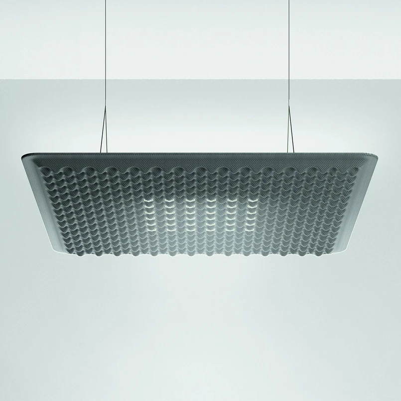 Suspensions de bureau Eggboard Matrix au format 80 x 80 cm - lumière directe et indirecte, insonorisation Le matériau de la suspension pour bureau LED Eggboard Matrix présente des propriétés d'absorption acoustique qui sont encore renforcées par la structure sinusoïdale de la surface. Cela favorise une acoustique de la pièce qui facilite la compréhension mutuelle lors des conversations. garantit l'efficacité acoustique. Eggboard Matrix diffuse à la fois une lumière indirecte par le plafond et un éclairage de travail direct. Celui-ci est homogène et agréable grâce aux réflecteurs rotosymétriques et aux nombreuses LED individuelles. La suspension LED Eggboard Matrix a été développée par Progetto CMR ; la fabrication est assurée par l'entreprise italienne Artemide qui, depuis sa fondation en 1960 par Ernesto Gismondi, est synonyme de produits répondant à tous les souhaits en matière de design et de fonctionnalité. La philosophie d'Artemide, qui consiste à créer un éclairage adapté aux besoins humains, est particulièrement bien incarnée par Eggboard Matrix. - gradation externe DALI
