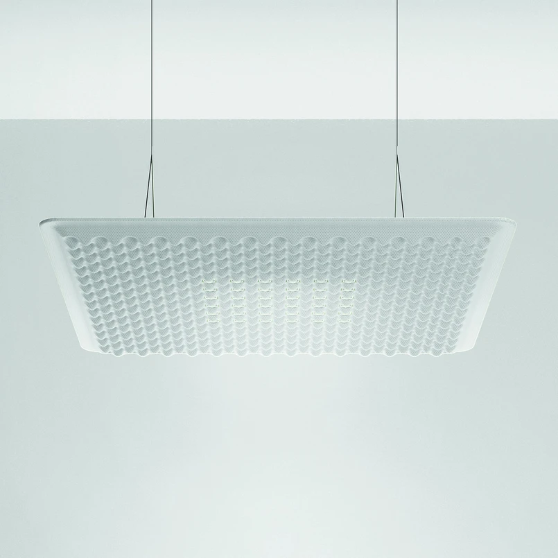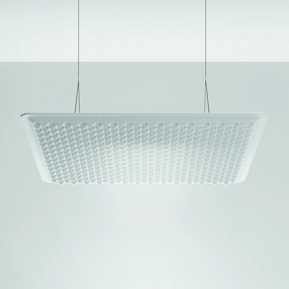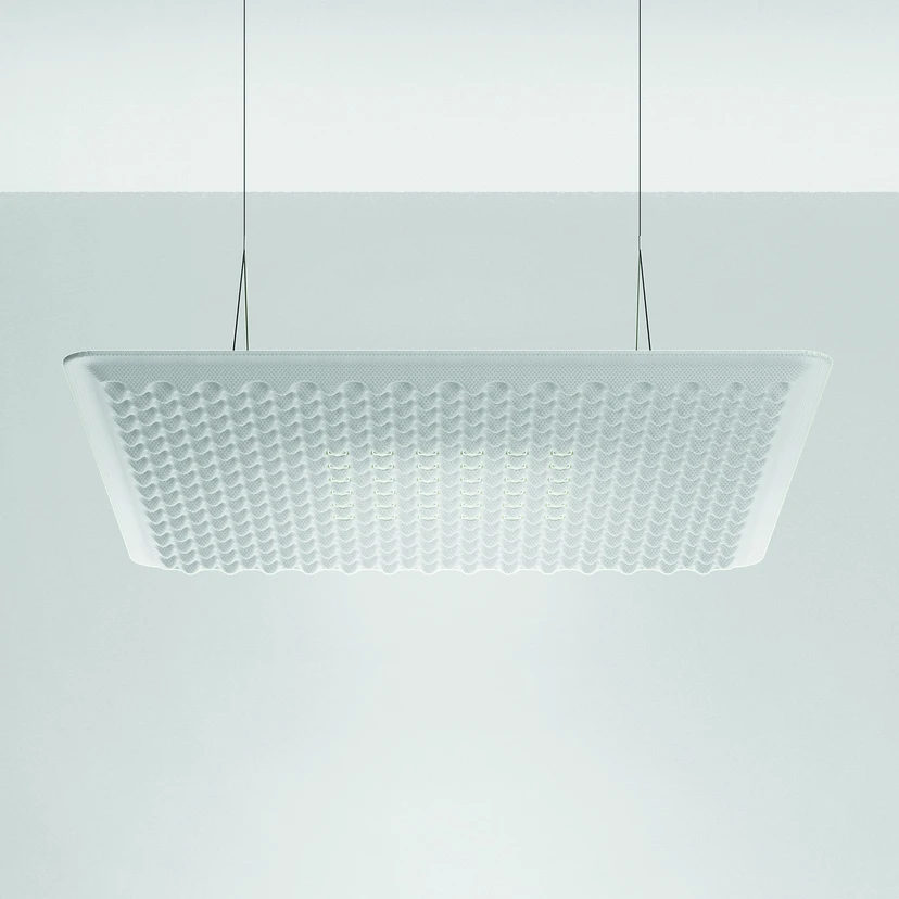 Suspensions de bureau Eggboard Matrix au format 80 x 80 cm - lumière directe et indirecte, insonorisation Le matériau de la suspension pour bureau LED Eggboard Matrix présente des propriétés d'absorption acoustique qui sont encore renforcées par la structure sinusoïdale de la surface. Cela favorise une acoustique de la pièce qui facilite la compréhension mutuelle lors des conversations. garantit l'efficacité acoustique. Eggboard Matrix diffuse à la fois une lumière indirecte par le plafond et un éclairage de travail direct. Celui-ci est homogène et agréable grâce aux réflecteurs rotosymétriques et aux nombreuses LED individuelles. La suspension LED Eggboard Matrix a été développée par Progetto CMR ; la fabrication est assurée par l'entreprise italienne Artemide qui, depuis sa fondation en 1960 par Ernesto Gismondi, est synonyme de produits répondant à tous les souhaits en matière de design et de fonctionnalité. La philosophie d'Artemide, qui consiste à créer un éclairage adapté aux besoins humains, est particulièrement bien incarnée par Eggboard Matrix. - gradation externe DALI
