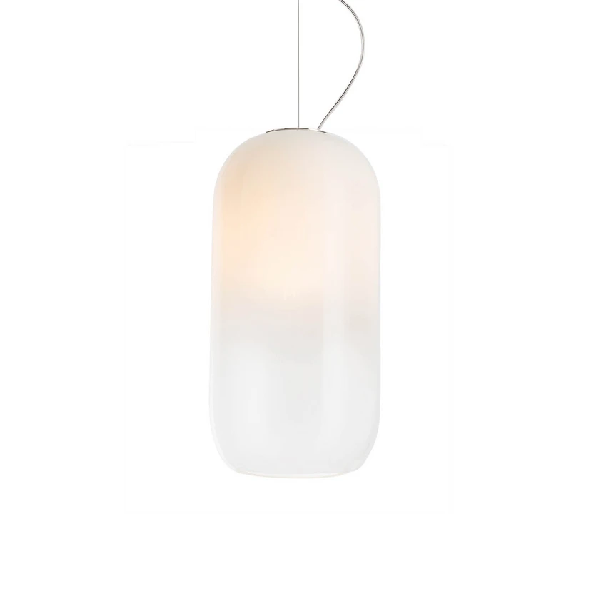 Lampe à suspension design Gople Mini avec un verre remarquablement beau Cette lampe à suspension décorative fait partie d'une série de lampes à suspendre, de plafonniers, de lampes de table et de lampadaires avec un abat-jour en verre fait main. Dans la série Gople, l'accent est mis sur l'abat-jour en verre qui diffuse la lumière de tous les côtés et qui, grâce à son dégradé de couleurs esthétique, attire particulièrement l'attention dans la pièce. Cet aspect est obtenu grâce à l'utilisation d'une technique artisanale vénitienne traditionnelle, qui fait appel à la fois au verre coloré et au cristal. La forme épurée souligne la modernité de ce diffuseur de lumière, qui peut s'harmoniser avec de nombreux styles d'aménagement contemporains. Le design créatif a été conçu par BIG (Bjarke Ingels Group), une coopération de designers et d'architectes qui possèdent des studios à Copenhague et à New York. Dans leurs travaux, ils utilisent des innovations techniques et mettent l'accent sur une mise en œuvre de leurs idées qui préserve les coûts et les ressources. Parmi leurs projets, on trouve par exemple le Musée maritime danois (2013), 8-Haus (2010) ainsi que la piscine portuaire de Copenhague. Le groupe Artemide a débuté en 1960 avec la création d'Artemide par Ernesto Gismondi et Sergio Mazza. La thèse directrice "The Human Light" reflète l'aspiration constante au développement et à la production de nouveaux produits design qui satisfont les besoins de l'homme en matière de lumière harmonieuse. Artemide distribue déjà ses produits de haute qualité dans 98 pays.