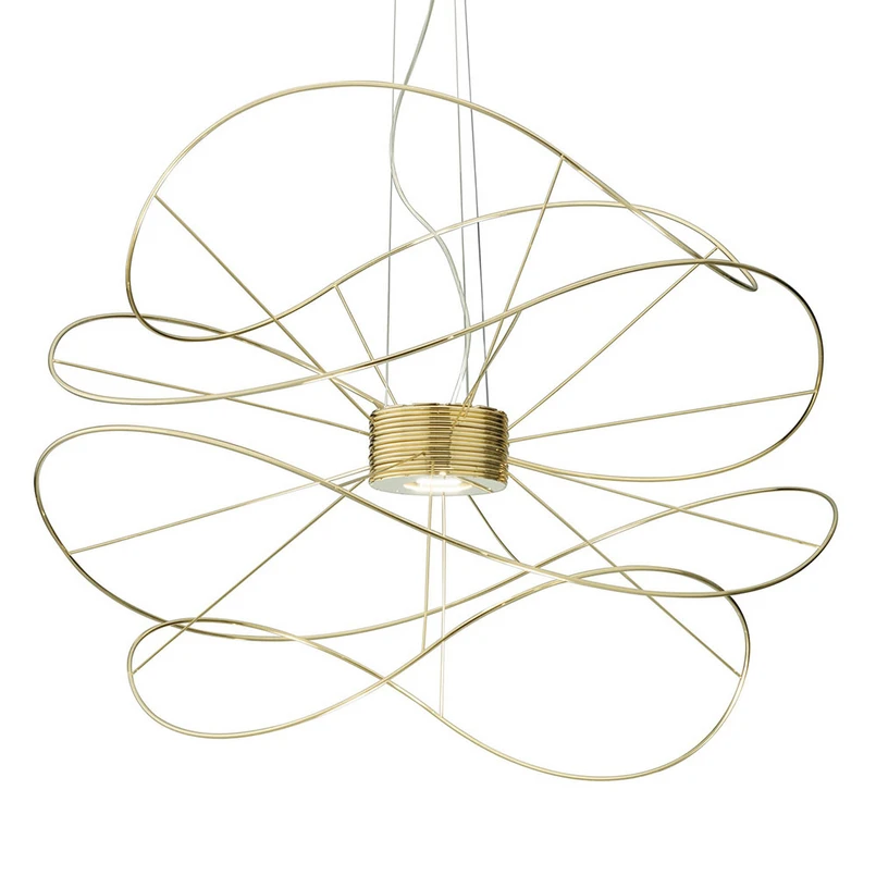 Les montants métalliques dorés, disposés ici en filigrane autour de la source lumineuse, sont travaillés en plusieurs fois et forment un maillage particulièrement métallique. On dirait un peu qu'elles sont filées comme des fils autour du centre de la lampe, qui consiste ici en une puissante source de lumière LED. Celle-ci rayonne doucement sa lumière blanche et chaude vers le bas. En même temps, la lumière est réfléchie par les parties dorées brillantes, ce qui donne un effet d'éclairage très agréable. Le métal et la lumière forment ici une symbiose particulière, qui apparaît élégante, stylée et pourtant très moderne.