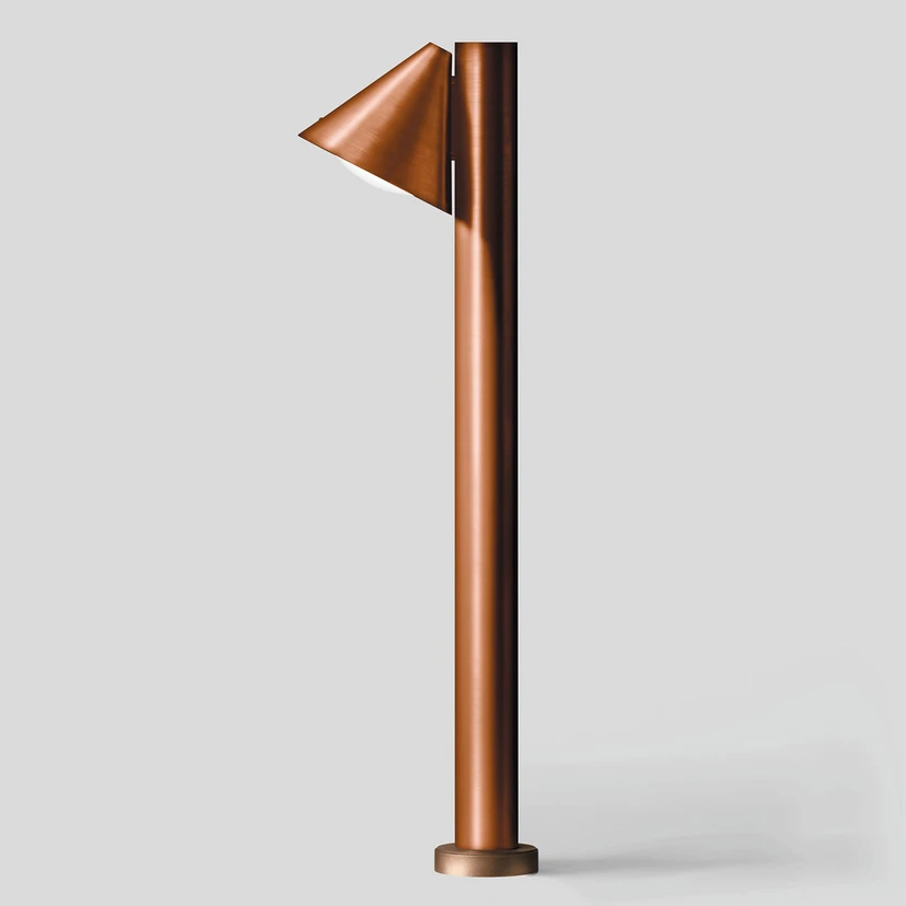 Borne lumineuse en cuivre 84072 avec lumière orientée en oblique vers le bas Une forme intemporelle, une technique d'éclairage moderne, une finition impeccable et le choix du cuivre, matériau traditionnel, font de la borne lumineuse 84072 un diffuseur de lumière de qualité et de caractère pour l'extérieur. Un abat-jour de forme conique, dont la sortie de lumière est orientée en oblique vers le bas, est fixé sur le côté de la structure cylindrique. La lumière est diffusée largement et en douceur sur la surface du sol située à côté du luminaire par un cache en verre opale soufflé à la bouche. Au fil du temps, le cuivre se patine de manière caractéristique sous l'effet des intempéries. - avec plaque de base en bronze coulé - protection : IP44 - résistance aux chocs : IK03