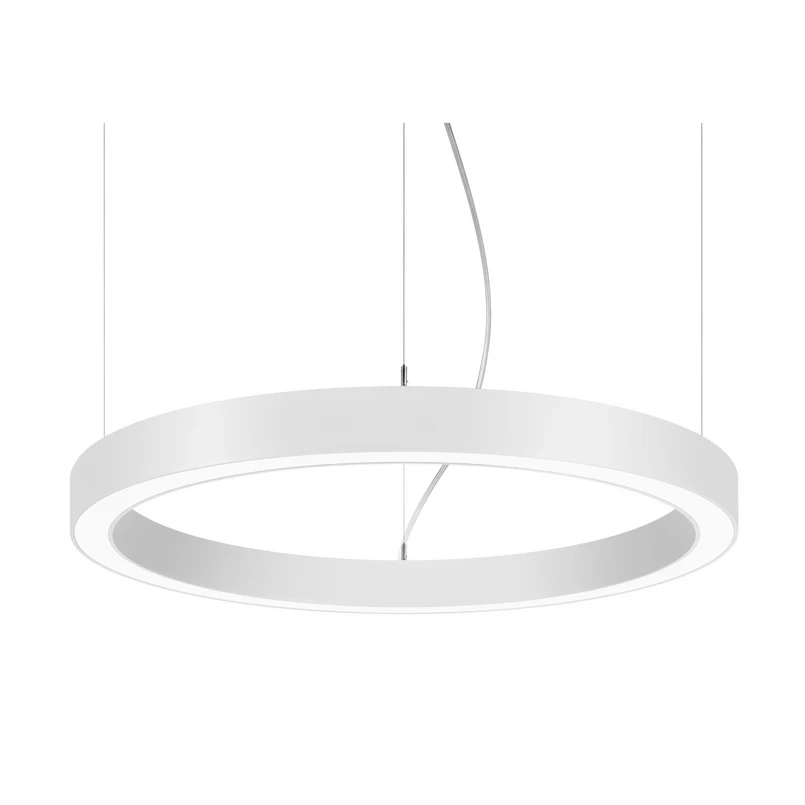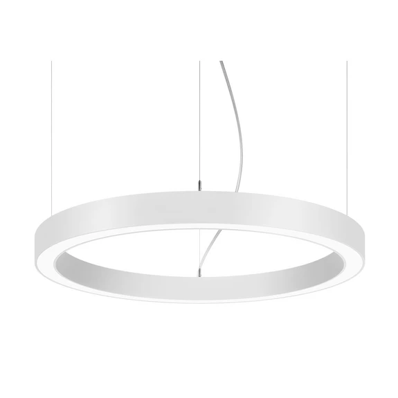 Suspension LED Biro Circle Ring, hauteur d'abat-jour 10 cm, Ø 75 cm, commutable Un anneau en aluminium constitue l'abat-jour de la suspension LED Biro Circle Ring de BRUMBERG. Celui-ci est suspendu directement au plafond par des câbles en acier filigranes, de sorte qu'il semble presque flotter dans la pièce grâce aux câbles en acier à peine visibles. Les spots LED montés sur le pourtour de l'anneau diffusent vers le bas une lumière puissante et répartie de manière optimale grâce à la répartition de l'intensité lumineuse à symétrie de révolution, profonde et large, et à un cache blanc opale en plastique. La suspension LED Biro Circe Ring est tout particulièrement conçue pour l'éclairage de bureaux et de salles de conférence, mais elle peut également éclairer efficacement et uniformément la table de la salle à manger dans le domaine privé. - indice général de rendu des couleurs CRI > 80 - durée de vie L70/B50 à 25 °C : 276.000 h, durée de vie L80/B20 à 25 °C : 153.000 h - matériau du boîtier : aluminium / acier / plastique - température ambiante admissible (ta) : -20 °C - +25 °C - avec index de rendu des couleurs LED, commutable, non graduable