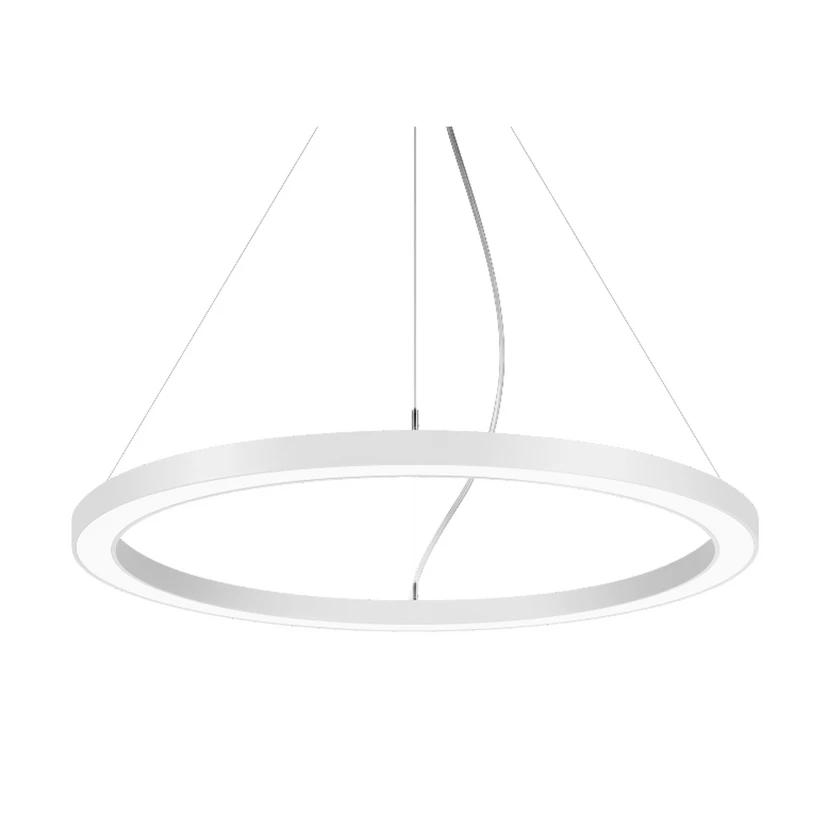 Suspension LED Biro Circle Ring5, commutable, avec rosace Un anneau plat en aluminium constitue l'abat-jour de la suspension LED Biro Circle Ring. Derrière un cache en plastique blanc opale, des LED ont été installées tout autour de l'anneau. Elles répartissent leur lumière de manière optimale et la diffusent avec force dans la pièce grâce à la symétrie de rotation de la répartition de l'intensité lumineuse en largeur et en profondeur et au cache. L'abat-jour en forme d'anneau flotte presque dans l'espace grâce à sa suspension par de fins câbles en acier au niveau du rosace rond - indice général de rendu des couleurs CRI > 80 - durée de vie L70/B50 à 25 °C : 276.000 h, durée de vie L80/B20 à 25 °C : 153.000 h - matériau du boîtier : aluminium / acier / plastique - température ambiante admissible (ta) : -20 °C - +25 °C - avec ballast électronique, commutable, non graduable