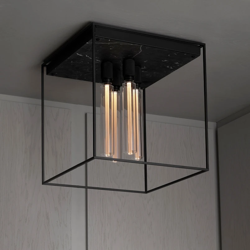 Avec son design caractéristique, le plafonnier LED à quatre flammes Caged Ceiling 4.0 attire le regard comme il se doit sur le plafond des pièces d'un intérieur moderne. La base est constituée d'un baldaquin carré, recouvert d'une plaque de marbre polie, sur laquelle sont posées quatre douilles E27 très rapprochées. Une cage cubique en métal noir se décharge vers le bas. Celle-ci forme le cadre pour les quatre lampes LED exceptionnelles de forme tubulaire fournies avec le luminaire. Elles ont été spécialement fabriquées par le fabricant pour la série de luminaires Caged, diffusent une lumière blanche chaude et agréable et complètent le design du luminaire. Placé dans de vastes entrées ou au-dessus de la table à manger ou du salon, le plafonnier Caged Ceiling 4.0 fait une déclaration.