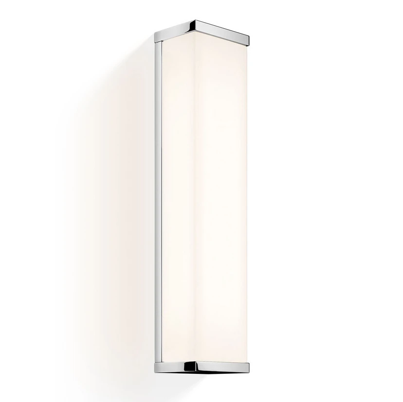 L'applique murale angulaire aux parties latérales chromées s'adapte aussi bien à la salle de bains, où elle résiste aux éclaboussures d'eau grâce à son indice de protection IP44, qu'à de nombreux autres domaines de la vie moderne. La lumière blanche chaude des LED est émise de manière très agréable par le diffuseur en acrylique blanc brillant.