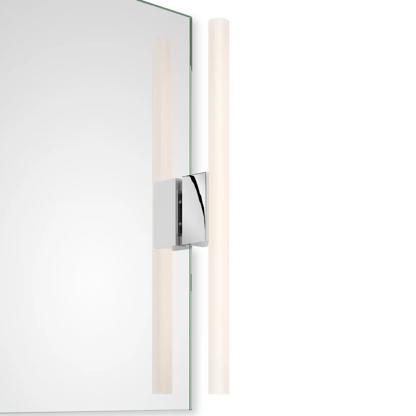 Lampe à miroir Omega 1 au design carré à fixer sur le miroirLa lampe à miroir Omega 1 est une source de lumière très pratique et rapide à installer sur un miroir d'une épaisseur maximale de 6 mm, car elle se fixe simplement sur le miroir. L'ampoule est insérée au centre de la douille carrée en métal et la largeur de l'applique peut varier en fonction de la longueur de l'ampoule.- dimmable avec variateur à coupure de phase- montage vertical ou horizontal