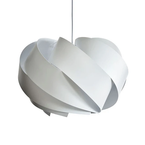Des bandes individuelles de plastique blanc ont été assemblées pour former l'abat-jour de la lampe suspendue Boleo. Ils forment une ombre de forme organique grâce aux éléments tourbillonnés qui serpentent autour de l'ampoule et la protègent. La lumière de l'ampoule située au centre (non incluse) est diffusée plusieurs fois et des effets uniques d'ombre et de lumière sont créés.
