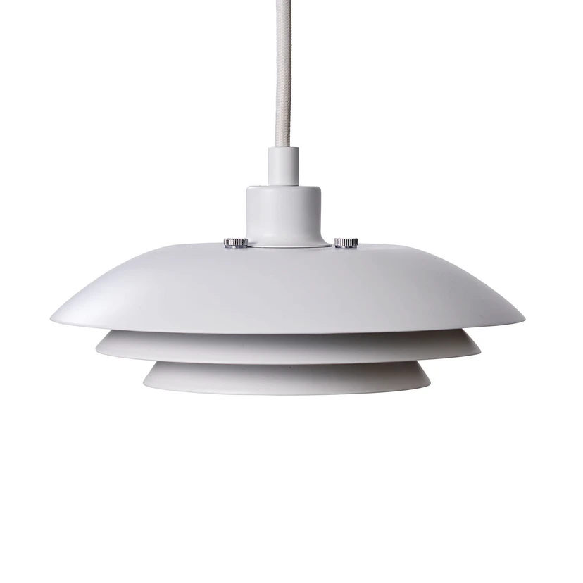 Suspension DL20 avec abat-jour métallique en trois parties DL20 est une suspension du label de luminaires danois DyBERG LARSEN qui séduit d'une part par son beau design scandinave et d'autre part par son rayonnement lumineux du plus bel effet. L'abat-jour de la lampe, composé de trois éléments en métal laqué mat de différents diamètres, permet à la lumière de l'ampoule (non incluse) placée au centre d'être diffusée non seulement directement vers le bas pour éclairer une surface située en dessous, mais aussi doucement et sans éblouissement de tous les côtés à travers les espaces entre les différents éléments.