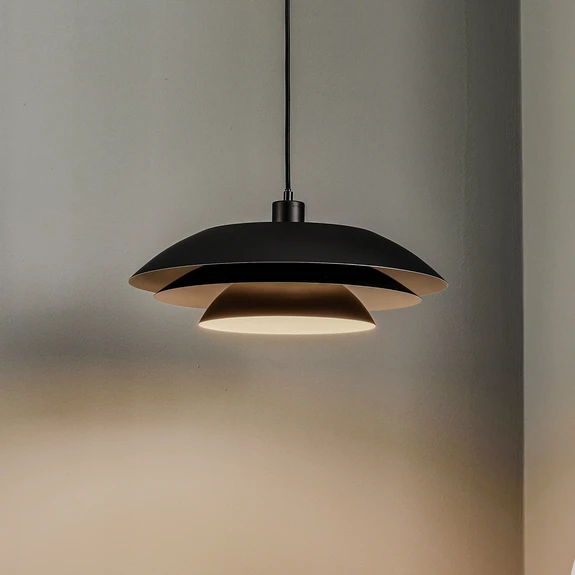 L'abat-jour de la suspension DL est en métal laqué avec une finition mate. Trois éléments de tailles différentes, en forme d'assiette, ont été placés les uns dans les autres pour former un abat-jour d'où la lumière s'échappe non seulement par l'ouverture vers le bas, mais aussi par les espaces intermédiaires tout autour. Ainsi, la suspension DL éclaire parfaitement et directement une surface de table tout en éclairant la pièce en général. Grâce à sa belle apparence et à son design scandinave, cette lampe s'intègre dans de nombreux styles d'aménagement et devient un diffuseur de lumière adapté au-dessus de la table de la salle à manger ou du comptoir de la cuisine, dont le plaisir durera longtemps.