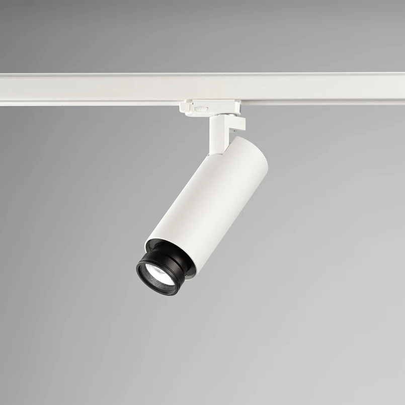 Spot sur rail Kelly à LED avec angle de rayonnement réglable de 15 à 90° Le spot sur rail Kelly à LED pour rail électrique triphasé est non seulement orientable et inclinable, mais son angle de rayonnement peut également être varié. Cette grande variabilité, combinée à un index de rendu des couleurs particulièrement bon, le rend parfait pour les locaux commerciaux de tous types, pour les galeries, les zones d'accueil, les couloirs et même pour les habitations privées. Le spot LED sur rail Kelly permet d'éclairer des objets selon les besoins, car en tournant la tête de lampe avant, l'angle de rayonnement peut être réglé en continu dans une plage allant de 15° étroits à 90° larges. Il est également possible de faire varier l'intensité (avec un variateur à coupure de phase externe), car un driver LED à intensité variable a été intégré au spot. Le spot LED sur rail Kelly est en aluminium et est équipé d'un adaptateur universel triphasé - spot LED orientable à 350°, pivotant à 90