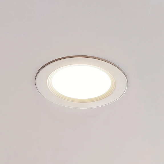 Luminaire encastrable LED Pan très plat en blanc La forme ronde et plate du luminaire encastrable LED Pan convient très bien, avec sa couleur blanche sobre, à l'installation dans les cuisines, les couloirs, les bureaux ou même les chambres à coucher. La polyvalence d'utilisation fait de ce spot pour plafond une source de lumière très appréciée. La technique LED moderne et de haute qualité est elle aussi remarquable. Des LED à économie d'énergie et à lumière claire sont installées à l'intérieur et diffusent une lumière blanche chaude. Elles créent ainsi en un clin d'œil une atmosphère agréable, quelle que soit la pièce. Grâce à son montage sans outil, le luminaire encastrable LED Pan convainc dès l'installation.