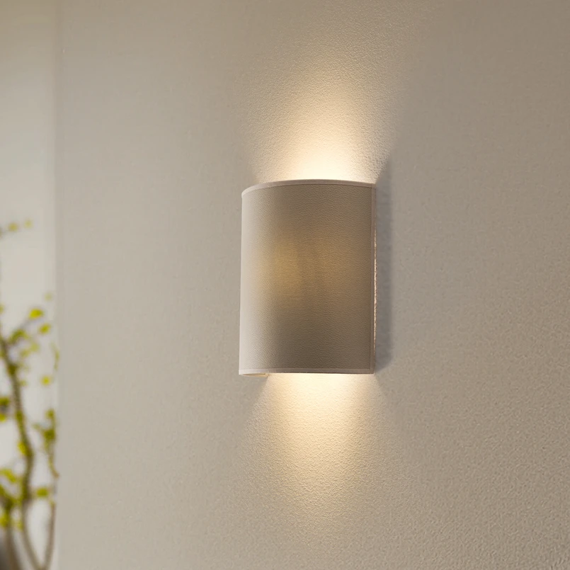 Applique murale semi-circulaire Idun - abat-jour végétalien en pelures de pomme L'applique murale Idun, fabriquée en Europe, est dotée d'un abat-jour beige clair en forme de demi-cylindre. Celui-ci est composé d'un simili-cuir végétalien obtenu à partir de pelures de pommes et offre un toucher agréable et naturel. La lumière est diffusée vers le haut et vers le bas.
