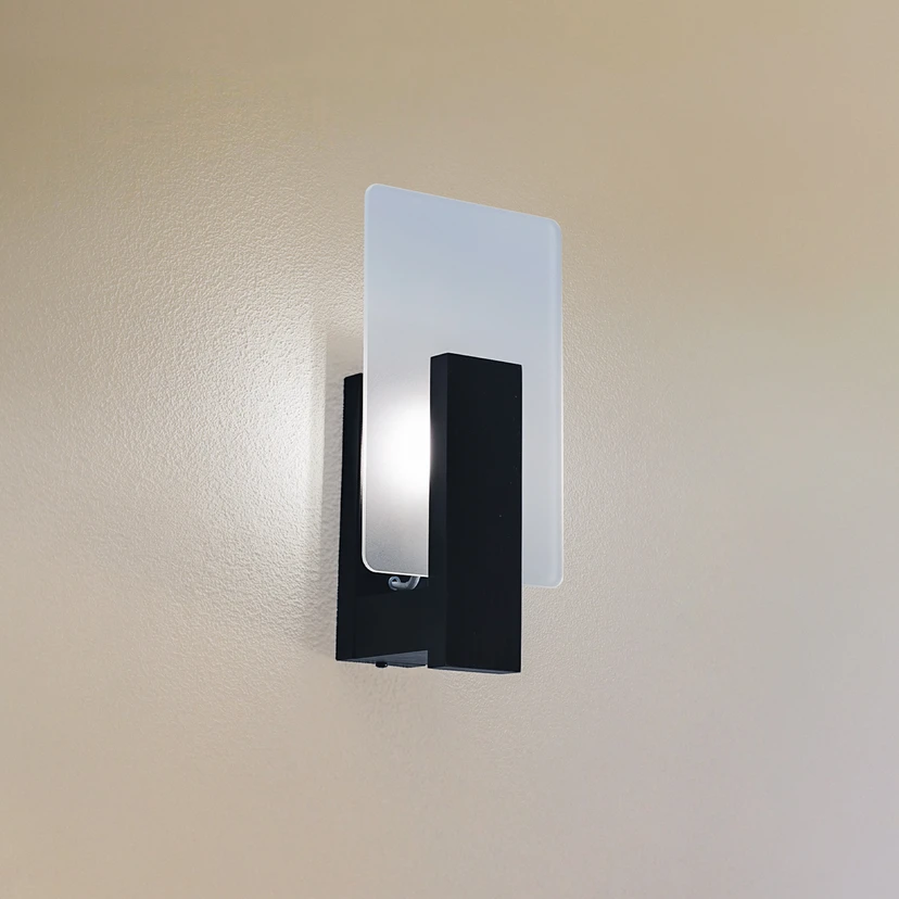 Applique rectangulaire Peach Puff avec support en bois noir et diffuseur en verre L'applique moderne Peach Puff de fabrication européenne séduit par la douceur de son effet lumineux, obtenu grâce au disque plat en verre satiné et à la diffusion indirecte sur le mur. Le corps noir est en bois. Derrière l'élément en verre, une ampoule de Ø 4,5 cm maximum / longueur 8,9 cm trouve sa place.