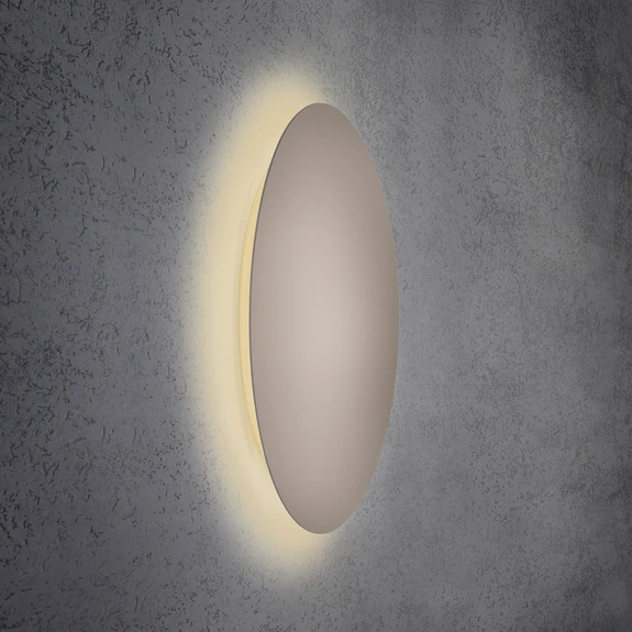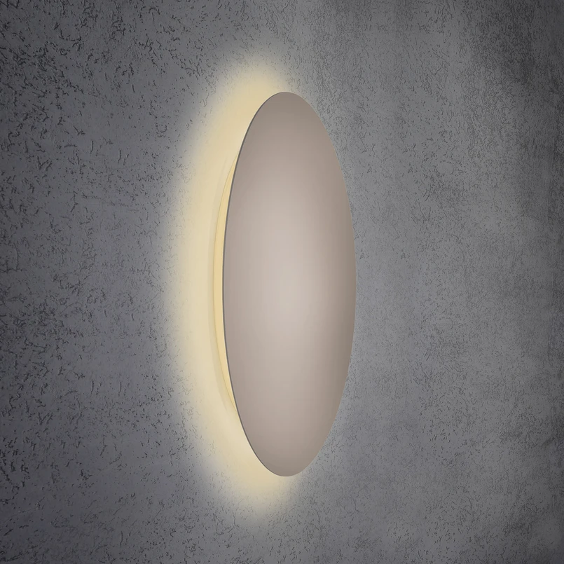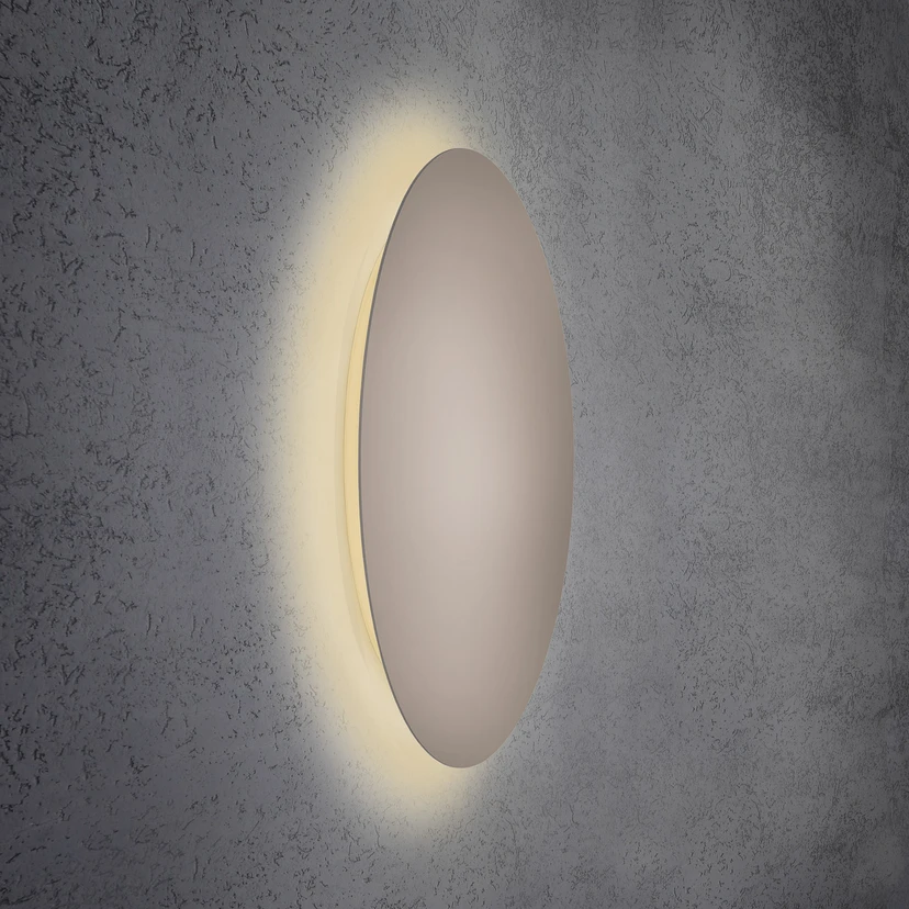 Les LED à rayonnement blanc chaud se trouvent à l'arrière, de sorte qu'elles créent un halo de lumière diffus sur le mur et permettent d'obtenir un éclairage indirect de la pièce. L'aspect du luminaire lui-même se limite à un disque plat et rond.