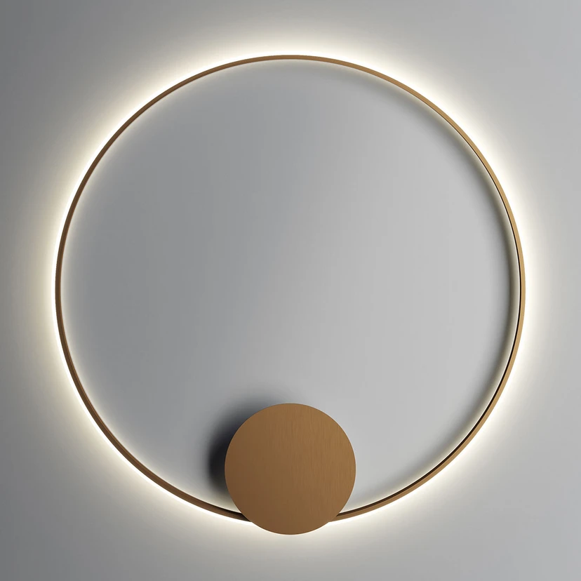 Un anneau métallique continu est garni de bandes de LED sur toute sa longueur à l'extérieur. Celles-ci assurent un éclairage direct et indirect et sont réglables à l'aide d'un interrupteur approprié. Un boîtier métallique de forme circulaire plus petite abrite l'électronique et le raccordement.