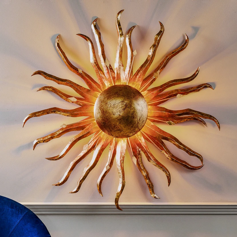 Applique murale SON GOLD GIGANTE- Un eyecatcher enchanteur L'applique murale SON GOLD GIGANTE peut être utilisée dans n'importe quelle pièce pour attirer le regard tout en diffusant chaleur et lumière. Les rayons du soleil forgés à la main réfractent la lumière, créant ainsi des jeux de lumière impressionnants. Le SONNE GOLD GIGANTE peut être utilisé aussi bien comme applique murale que comme plafonnier. Ce luminaire est d'une beauté unique et offre un éclairage indirect agréable.