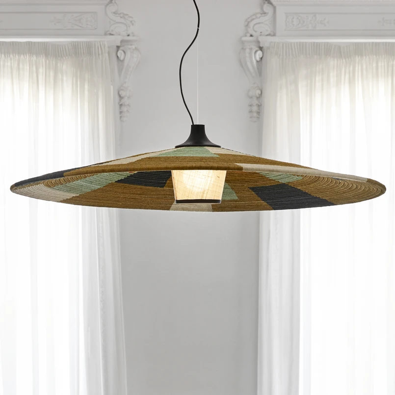 La lampe à suspendre Parrot XXL attire l'attention par son abat-jour particulièrement grand, fabriqué en rotin et en abacá, une plante originaire d'Asie orientale. Il est composé de petites cordes superposées qui ont été conçues dans différentes couleurs, créant ainsi un motif extraordinaire. La suspension en textile et le baldaquin métallique sont noirs et complètent l'aspect de la suspension. À l'intérieur, la douille de l'ampoule est entourée d'un diffuseur séparé, ce qui permet à la lumière d'être diffusée dans l'environnement sans éblouir. Il est possible de faire varier l'intensité du luminaire à l'aide d'un variateur externe et d'une ampoule adaptée.