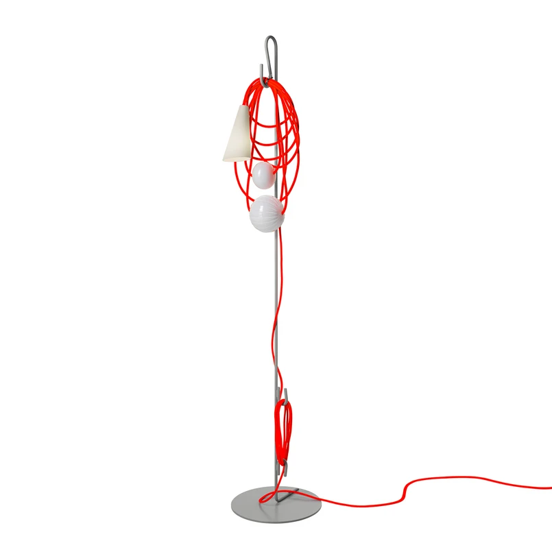 Lampadaire LED Filo exceptionnel avec câble textile et éléments en verreLe lampadaire LED Filo se compose d'une fine structure métallique qui dispose de supports pour le câble textile sur les côtés inférieur et supérieur. Les deux éléments décoratifs en verre soufflé à la bouche et moulés à la main lui confèrent un aspect particulier. L'abat-jour conique a été fabriqué en porcelaine et dirige la lumière chaude vers le bas. L'éclairage diffus et discret de la pièce crée une atmosphère chaleureuse. Le lampadaire peut par exemple être utilisé de manière idéale dans le salon ou dans le couloir. Grâce à ses différentes variations de design et de couleur, il s'intègre facilement dans différents environnements domestiques. L'interrupteur se trouve sur le câble textile.La série de luminaires Filo a été conçue par le designer italien Andrea Anastasio. Celui-ci voulait mettre en valeur les différents éléments d'un luminaire et les mettre en scène. En outre, Anastasio tenait à mettre en évidence les caractéristiques esthétiques et techniques de la lampe de table. Dans ce contexte, les éléments décoratifs en verre devaient jouer un rôle particulier. Tous les composants et matériaux du lampadaire dialoguent entre eux et confèrent à Filo son design exceptionnel, ce qui fait de cette lampe un point de mire dans chaque espace de vie.