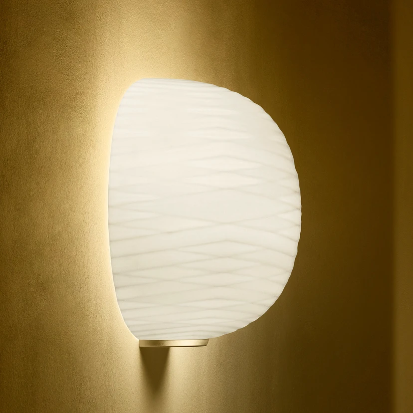 La gemme se caractérise par un abat-jour en verre soufflé à la bouche avec un motif géométrique de rainures sur la surface. Le verre satiné bloque la lumière, donnant à la pièce un éclat chaleureux. La disposition des rainures donne au luminaire un aspect fluide et très doux pour l'œil. Pour concevoir le luminaire, les designers Ludovica et Roberto Palomba se sont inspirés des ondes sonores qui frappent un liquide. Le résultat est le motif fluide qui caractérise le luminaire mural Gem et en fait un accent lumineux exceptionnel.