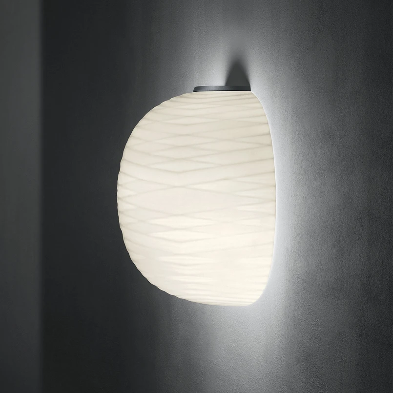 La gemme se caractérise par un abat-jour en verre soufflé à la bouche avec un motif géométrique de rainures sur la surface. Le verre satiné bloque la lumière, donnant à la pièce un éclat chaleureux. La disposition des rainures donne au luminaire un aspect fluide et très doux pour l'œil. Pour concevoir le luminaire, les designers Ludovica et Roberto Palomba se sont inspirés des ondes sonores qui frappent un liquide. Le résultat est le motif fluide qui caractérise le luminaire mural Gem et en fait un accent lumineux exceptionnel.