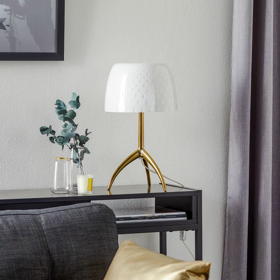 Lampe de table Lumiere 30th avec variateur : création anniversaire avec motif de bulles dans le verreUn luminaire qui se distingue par son esthétique et sa fonction est la lampe de table Lumiere, créée en 1990 par Rodolfo Dordoni, qui a rendu célèbre l'entreprise de luminaires italienne Foscarini. Depuis, la gamme de ce luminaire classique a été complétée par des lampes de table, des lampadaires et des plafonniers. En 2020, une nouvelle lampe de table viendra s'ajouter à cette série à succès. Ce qui est particulièrement frappant sur la lampe de table Lumiere 30th, c'est le motif de bulles qui apparaît sur l'abat-jour en verre de Murano soufflé à la bouche et qui confère à la lumière un effet incomparable. Comme pour les lampes de table précédentes, l'abat-jour repose sur un support métallique à trois pieds. L'entreprise de luminaires Foscarini produit depuis 35 ans des luminaires design d'une beauté et d'une qualité exceptionnelles selon la prémisse "Fare. Luce" : transporter et éclairer de manière nouvelle des contenus par le biais de la forme d'un luminaire.
