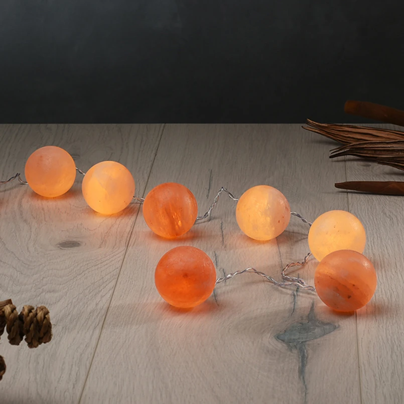 La guirlande lumineuse Cristaux lumineux avec 8 cristaux de sel en forme de boule de HIMALAYA SALT DREAMS séduit par l'ouverture percée dans chaque morceau de sel pour accueillir les 8 LED qui illuminent les cristaux de sel ronds de l'intérieur et les font briller de mille feux.