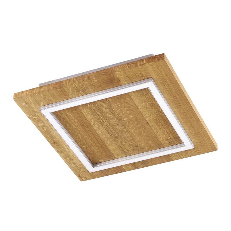 Plafonnier LED carré en bois Mia avec lumière directe et indirecte, switch-dimLe plafonnier Mia se caractérise par une forme simple avec un cache carré plat et le matériau bois - le choix parfait pour créer un accent naturel dans les espaces de vie modernes. En outre, Mia séduit par ses deux zones LED situées sur la face inférieure et sur la face arrière de l'écran, ce qui permet d'obtenir un éclairage direct et indirect. La commande s'effectue par le biais d'un interrupteur mural traditionnel. Le plafonnier à LED peut également être gradué (plusieurs commutations successives), le dernier réglage sélectionné étant réactivé après le nouvel allumage.- bois issu de forêts gérées durablement et de fournisseurs certifiés FSC- bon rendu des couleurs : CRI > 90- dim-to-warm : la gradation permet de modifier la couleur de la lumière de blanc universel (4.000 K) à blanc chaud (2.200 K)- fabrication en Allemagne
