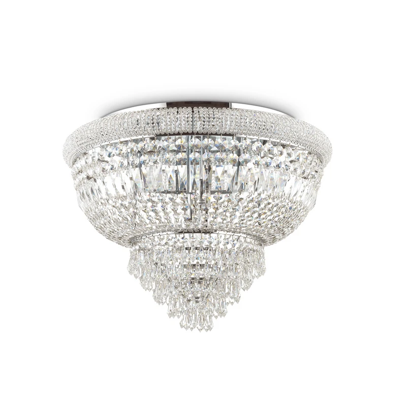 Grand plafonnier en cristal Dubai avec structure chromée Le plafonnier Dubai est à la fois un diffuseur de lumière et un accroche-regard. À l'intérieur se trouve une structure métallique de couleur chrome qui abrite au total 24 douilles E14. L'abat-jour est composé de nombreux éléments en verre clair taillé et en cristal qui, une fois la lumière allumée, créent un spectacle époustouflant d'effets lumineux étincelants.