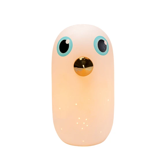 Lampe de table Birdie en céramique et porcelaineMinimaliste et décorative dans le salon ou même dans la chambre d'enfant, la lampe de table Birdie en céramique et porcelaine de couleur blanche avec de grands yeux et un nez pointu et doré est déjà une jolie décoration éteinte. Lorsque la lumière est allumée, les poches d'air irrégulières dans la partie inférieure du corps ovale en céramique créent de beaux points lumineux plus clairs, tandis que le reste du corps est éclairé de manière uniforme.