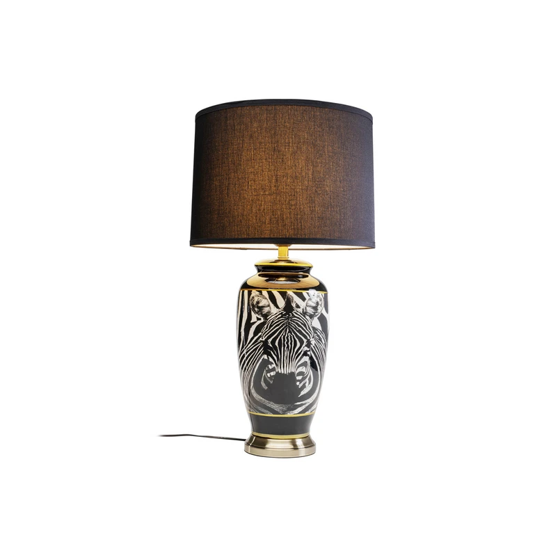 Lampe de table Zebra Face avec abat-jour en tissu noir et motif zèbre La lampe de table Zebra Face est élégante, à la mode et avec une touche de safari. L'abat-jour cylindrique est fabriqué en textile polyester noir. Le pied en porcelaine est orné d'un motif zèbre et de touches de couleur laiton.