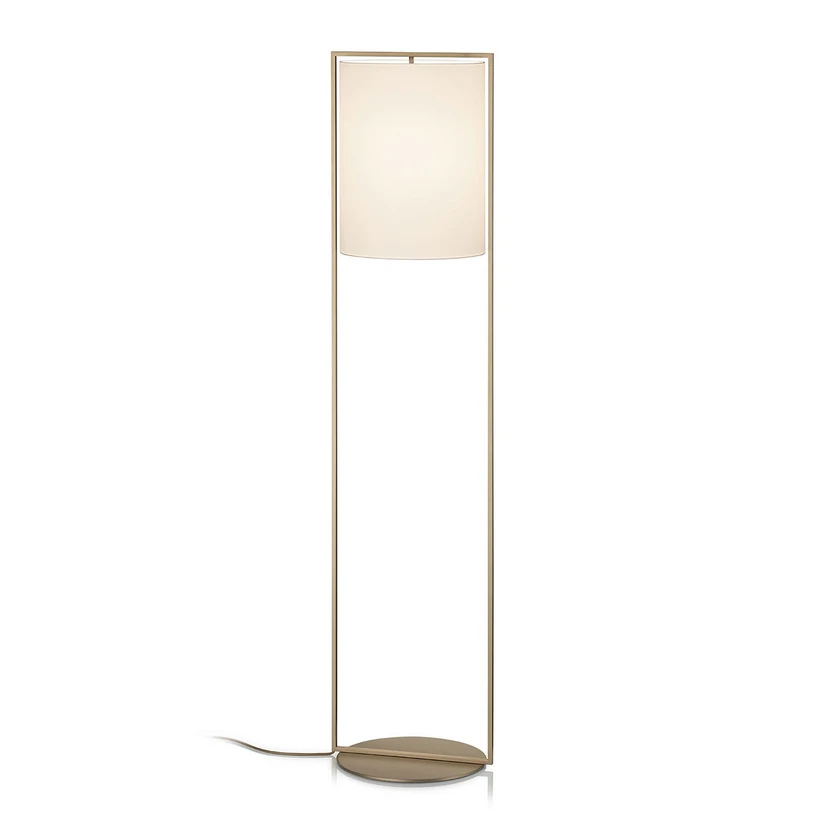 Un abat-jour cylindrique en chintz blanc et un pied plat et rond en métal, reliés par un cadre sobre à l'aspect bronze : voici le lampadaire moderne Alva. Cet objet d'aménagement minimaliste est idéal comme éclairage d'appoint d'ambiance dans les espaces de vie modernes.