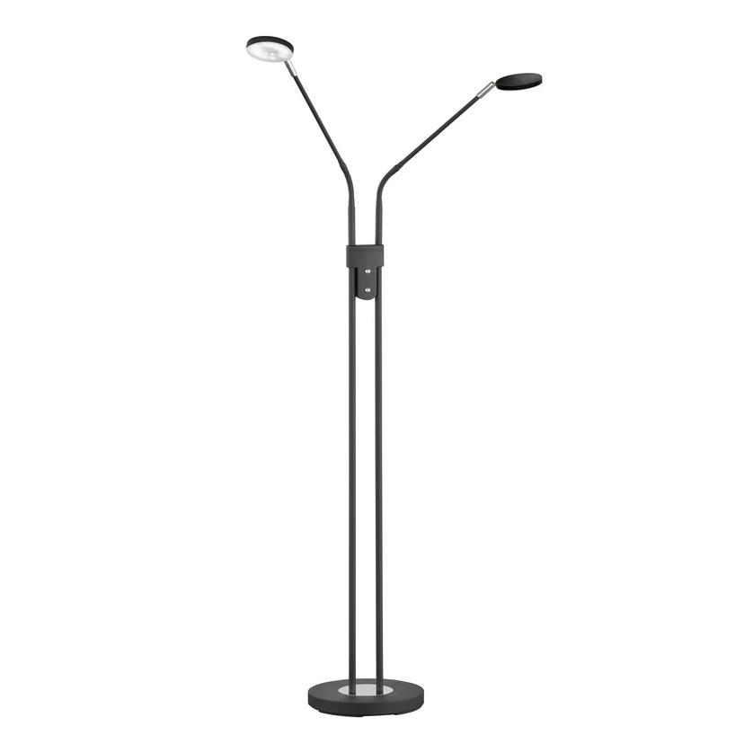 Lampadaire LED Lunia, à deux flammes, à intensité variable et avec fonction CCTLe design du lampadaire à deux flammes Lunia est synonyme de sobriété et de minimalisme. Ce luminaire trouve parfaitement sa place dans un salon ou une chambre à coucher et sert de diffuseur de lumière d'ambiance. Outre la fonction CCT, qui permet de régler la couleur de la lumière dans une plage allant de l'éclairage blanc chaud au blanc lumière du jour, Lunia peut être gradué en continu. Les deux sources lumineuses peuvent être réglées indépendamment l'une de l'autre grâce à des interrupteurs/variateurs séparés sur la structure.