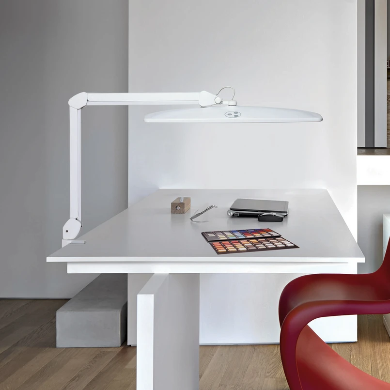 La lampe à pince à LED MAULexplore dispose d'une tête de lampe inclinable et pivotante dans laquelle sont intégrées des LED très efficaces dans la couleur de lumière du jour. Grâce à la pince de table pratique, MAULexplore peut être fixée sur des tables et des étagères. La plage de serrage est de 1 à 6,3 cm. Le bras métallique robuste est également orientable et inclinable. MAULexplore convient aussi bien pour le bureau à la maison que pour l'éclairage de table partout où une lumière claire et réglable individuellement est nécessaire pour un travail précis, comme par ex. dans les laboratoires, les ateliers, les postes de travail dans le domaine technique ainsi que dans les ateliers.