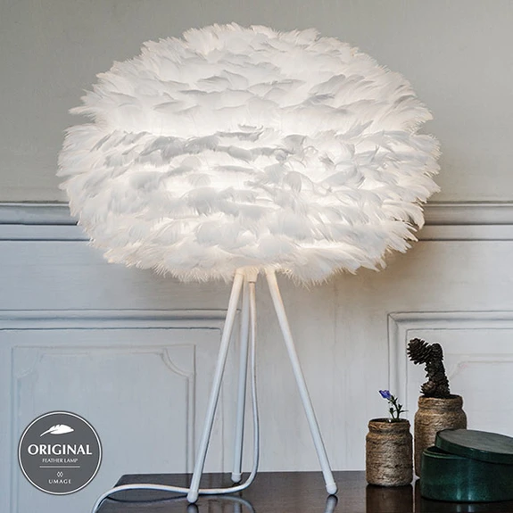 Lampe à poser Eos medium blanche avec très bel abat-jour en plumes
