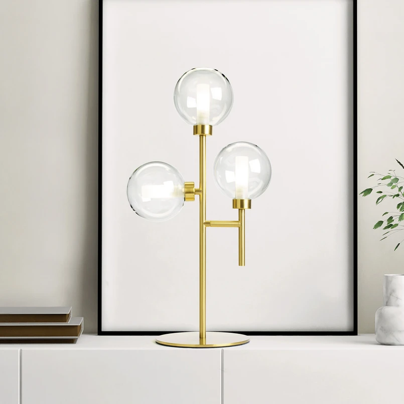 Lampe de table Dom à 3 lampes en finition or brossé avec abat-jour sphérique en verre transparent La lampe de table Dom est un diffuseur de lumière rayonnant de tous côtés qui enrichit avec une élégance savante les espaces de vie et de détente. Le corps en métal à la finition dorée brossée se compose d'un pied rond et d'une structure de bras fixée dessus. Cette dernière supporte les trois abat-jour de forme sphérique en verre borosilicaté transparent. Chacun d'entre eux contient un cylindre satiné dans lequel se trouve l'ampoule. Équipé d'un interrupteur à variateur.